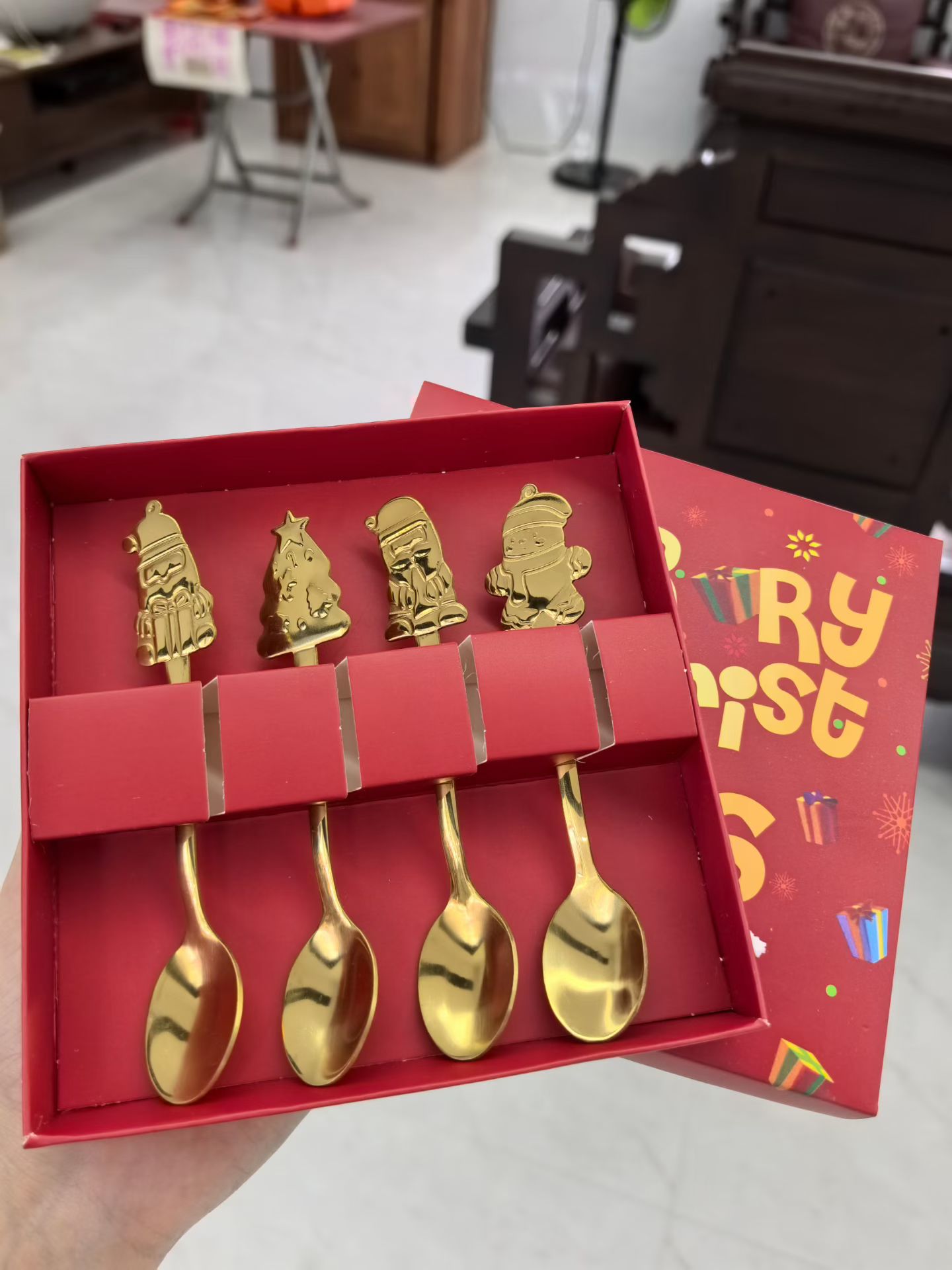 Bring a classic and warm touch to your table with our gold-finished spoon set. Each spoon features a different beloved Christmas icon: